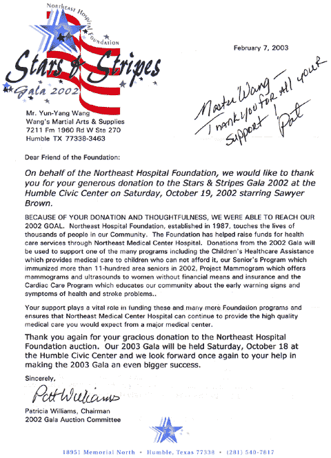 | Wang's Martial Arts student donated $2000.00 to